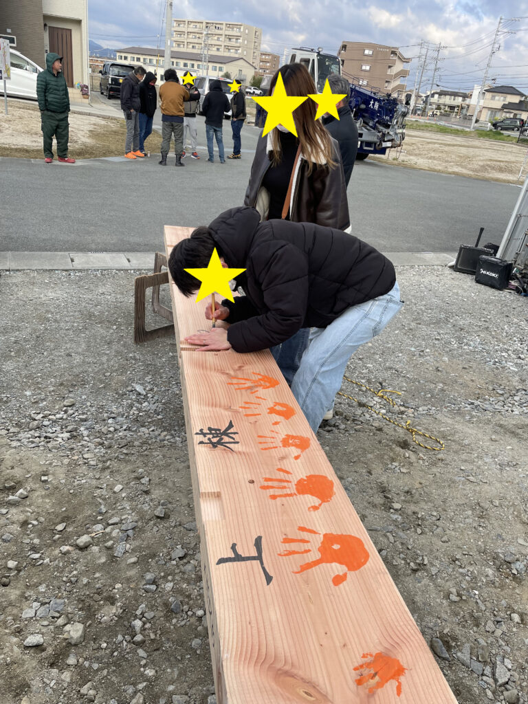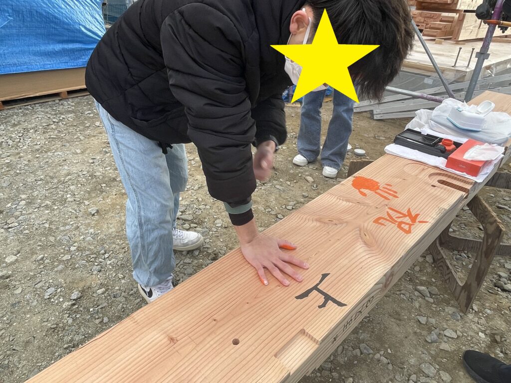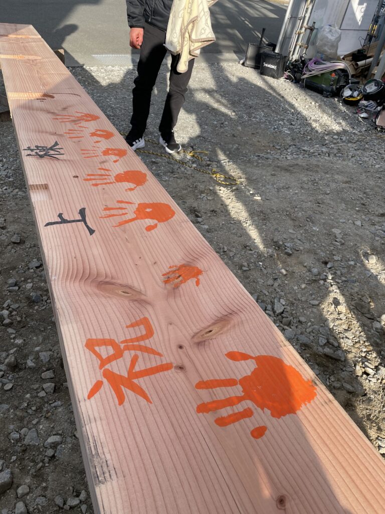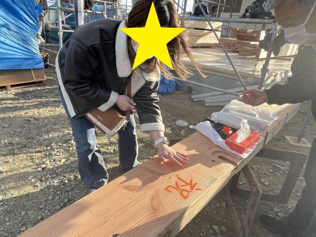 お家づくりの記念に家の中心の梁(はり)に