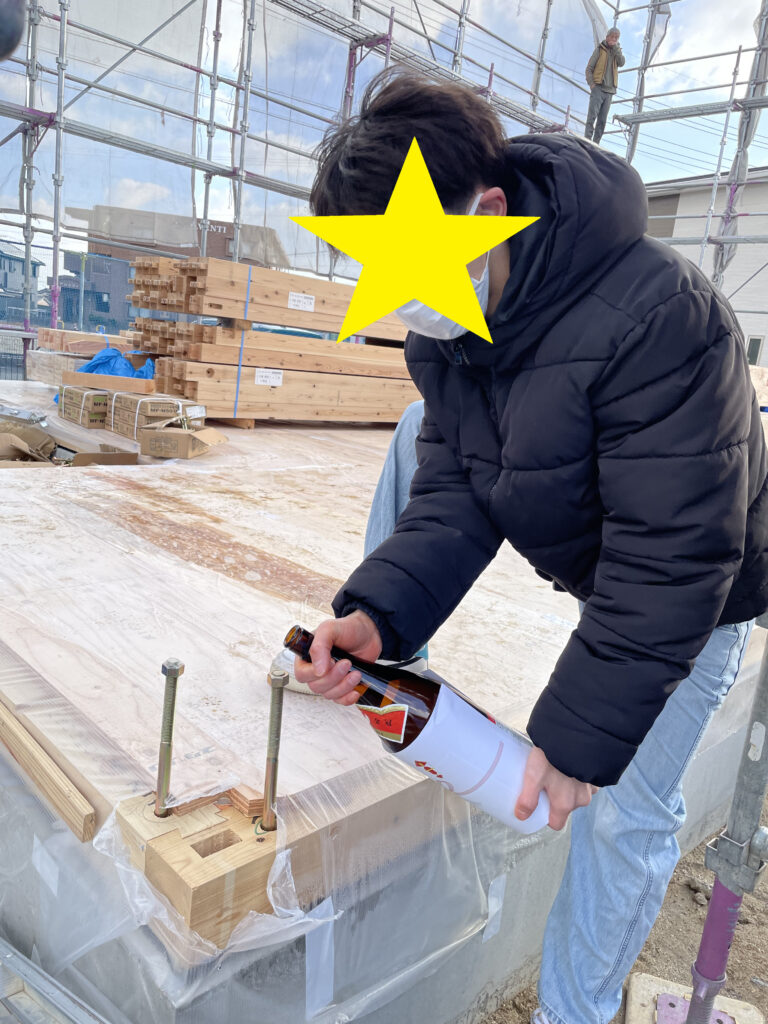 建物の四方にお神酒でお清めをして頂きました。